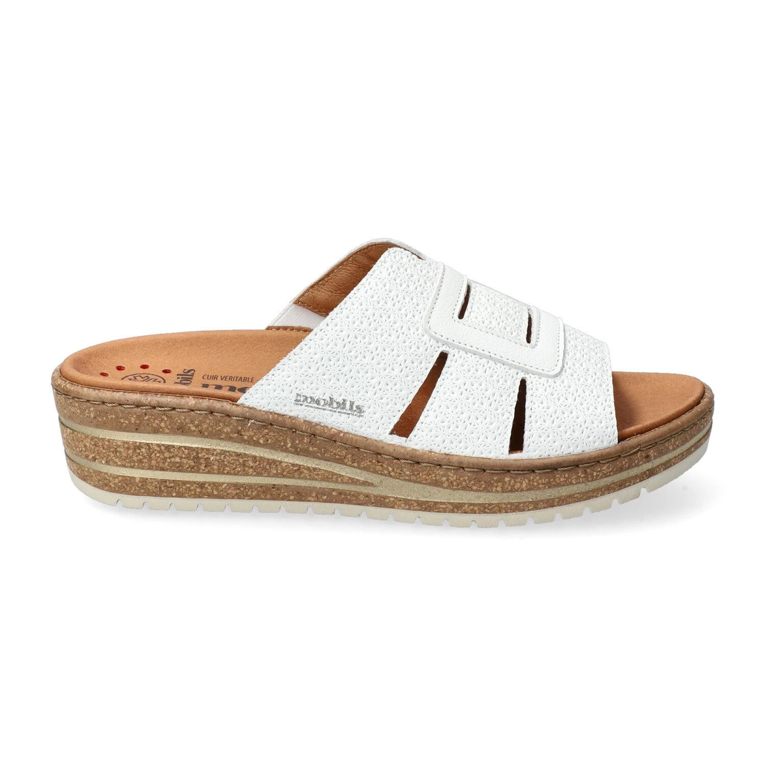 La chaussure confortable mule femme, modèle Romee, possède un talon compensé de 4 cm dont une hauteur de cambrure du 2 cm. La semelle est cousue en liège polyuréthane avec shock absorber.