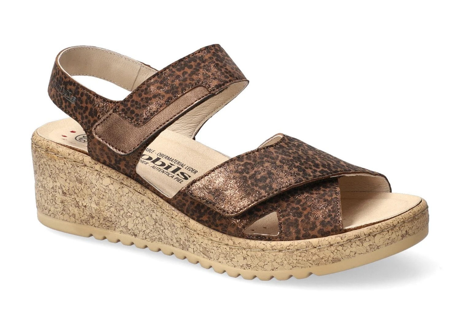 La chaussure confortable sandale femme, modèle Noor, possède un talon compensé de 4 cm. La semelle est cousue en liège polyuréthane avec shock absorber. Elle possède deux velcros sur le coup de pied.